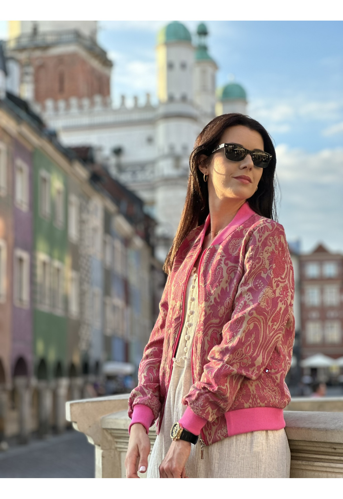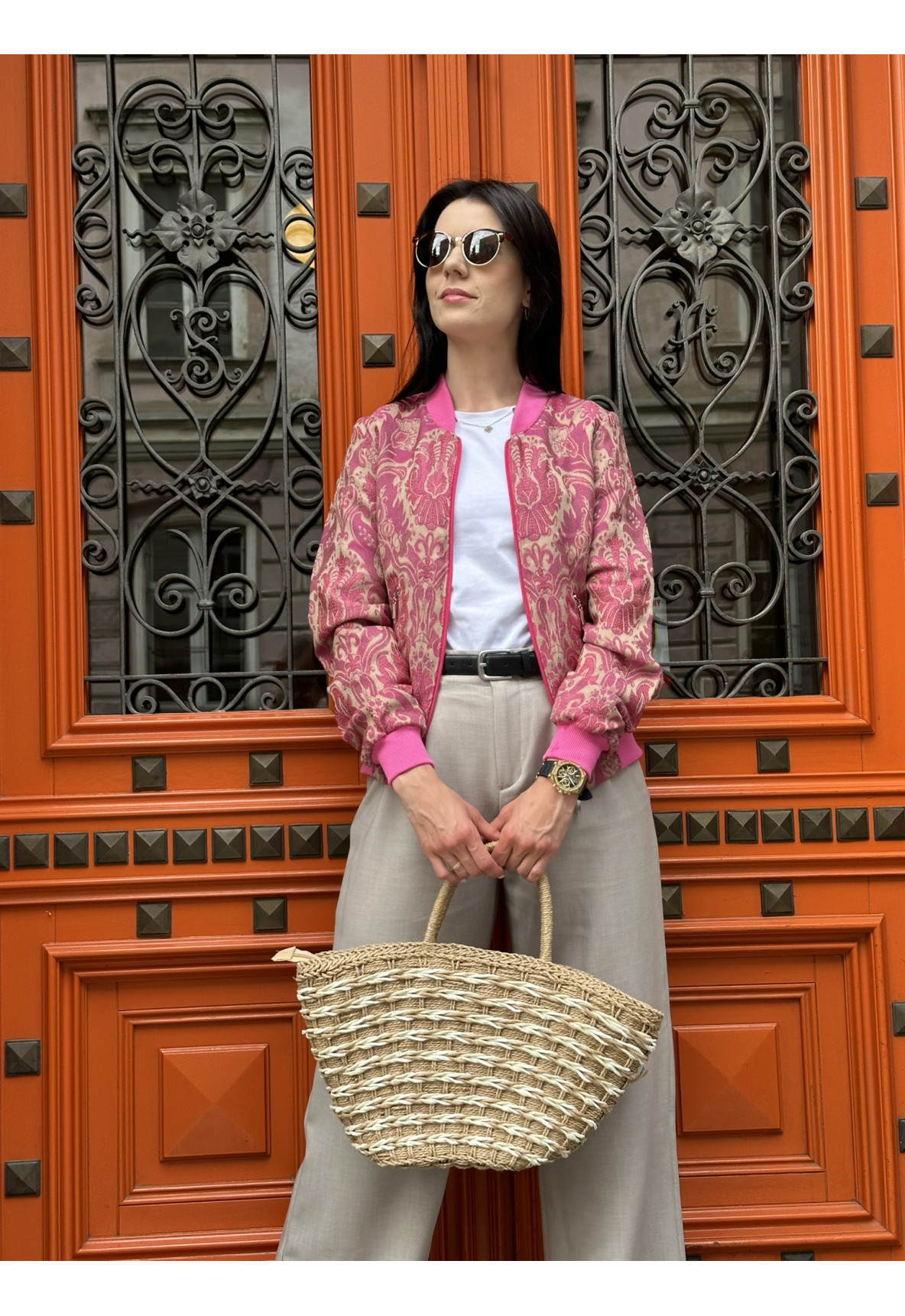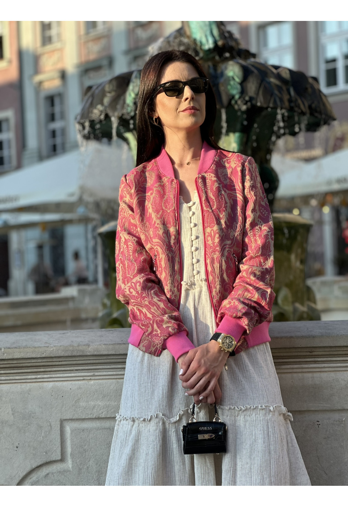 Różowe gobeliny idealnie współgrają z beżowym tłem a odważny róż stójki oraz ściągaczy nadaje jej charakteru.