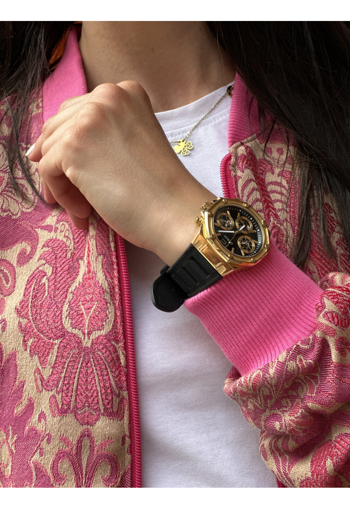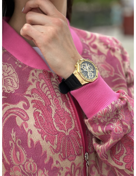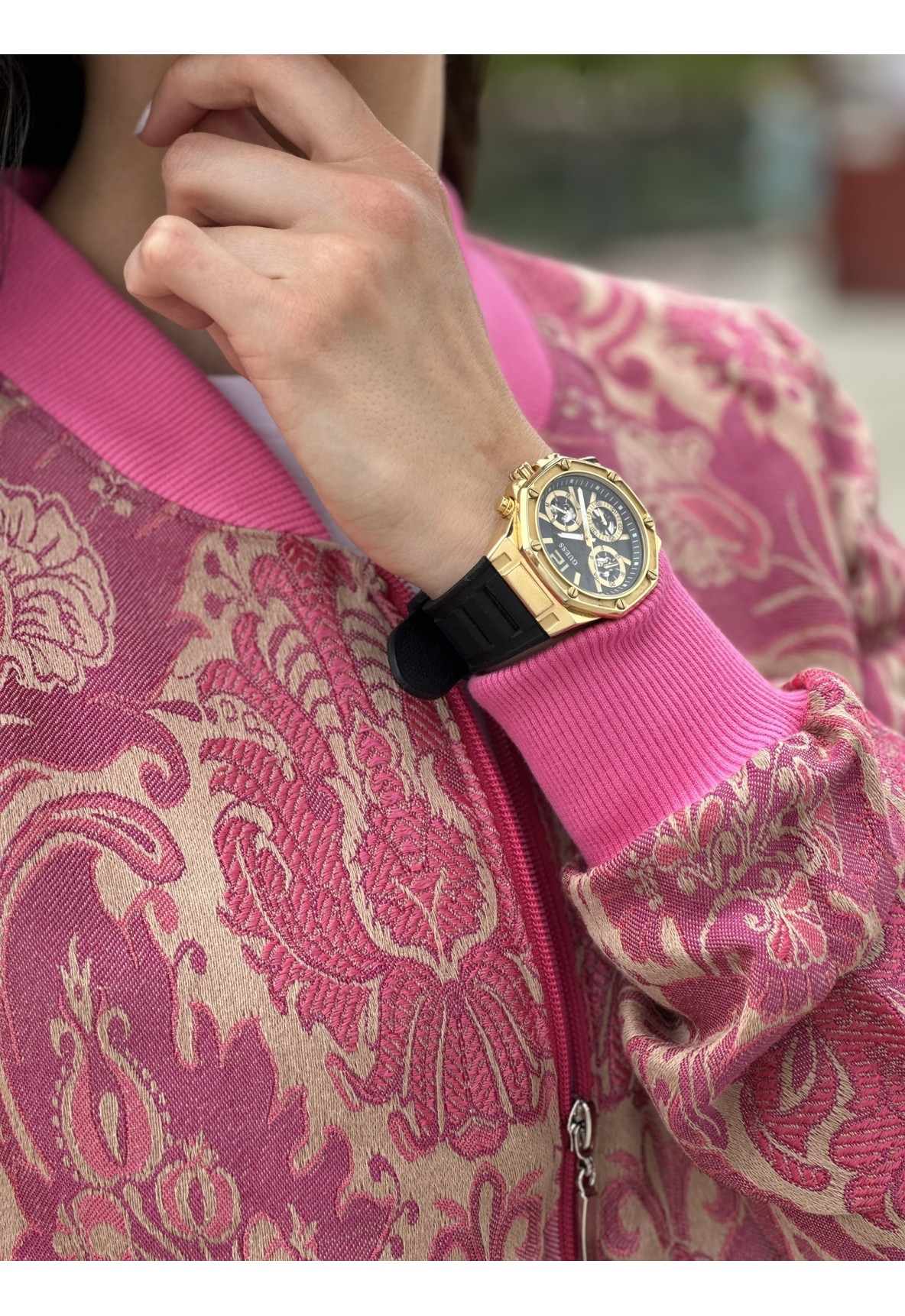Różowe gobeliny idealnie współgrają z beżowym tłem a odważny róż stójki oraz ściągaczy nadaje jej charakteru.