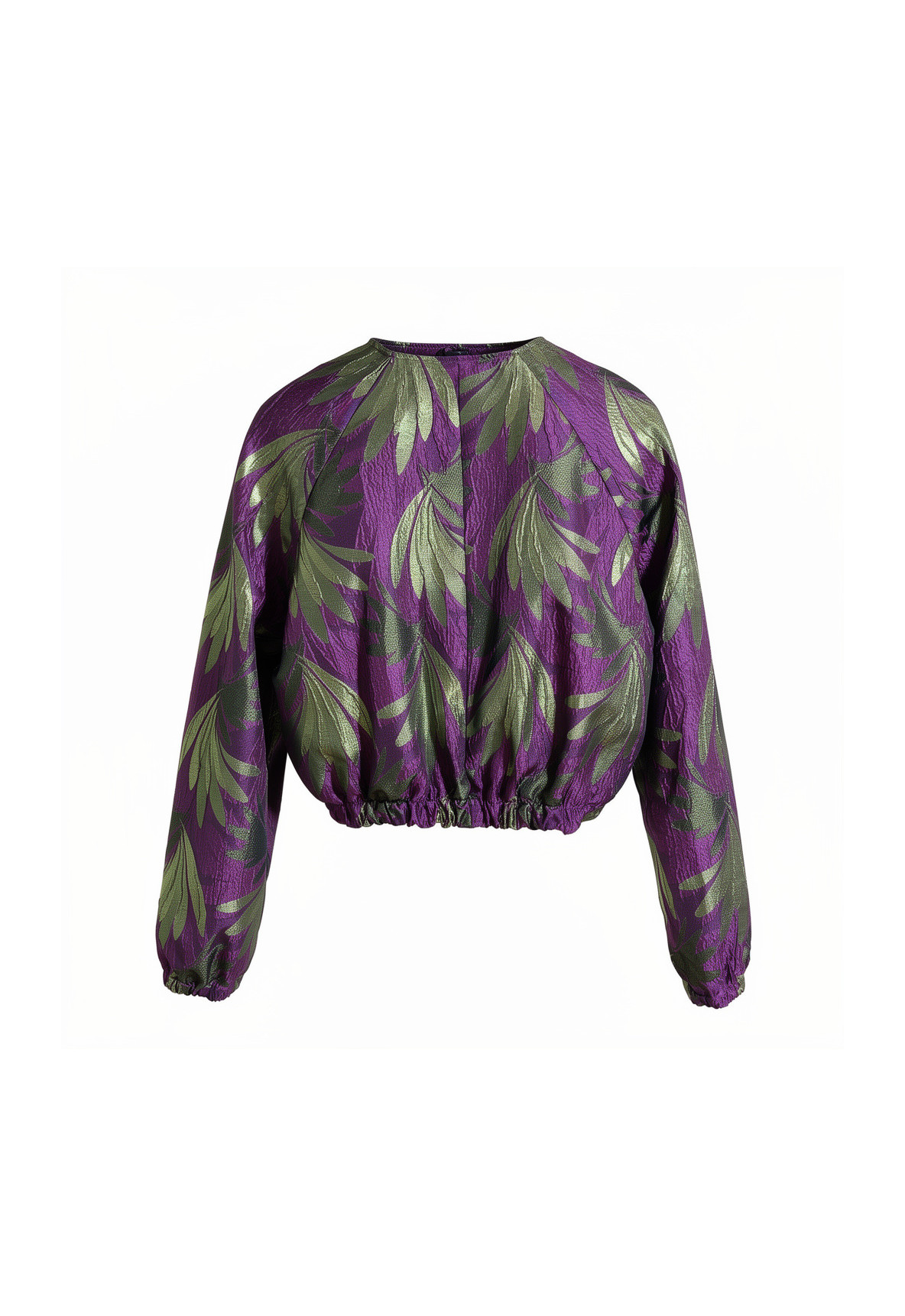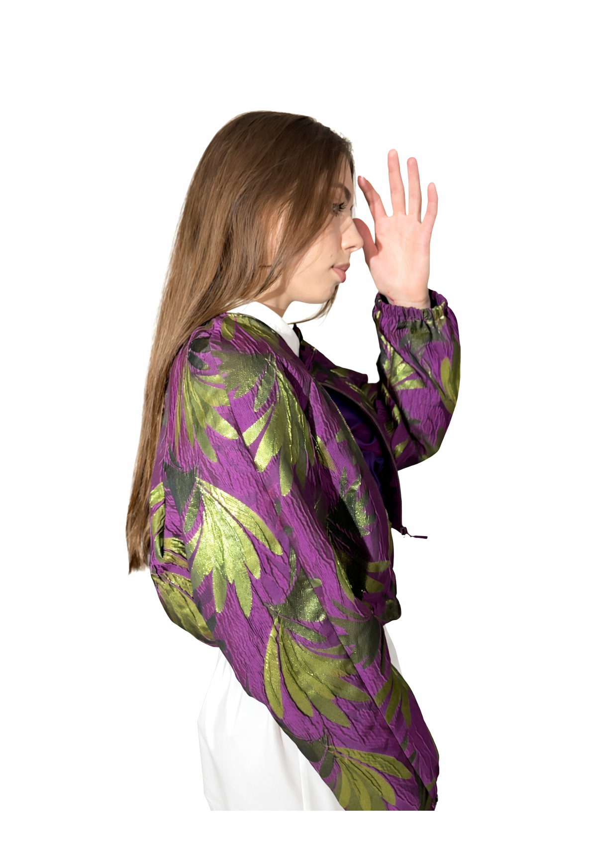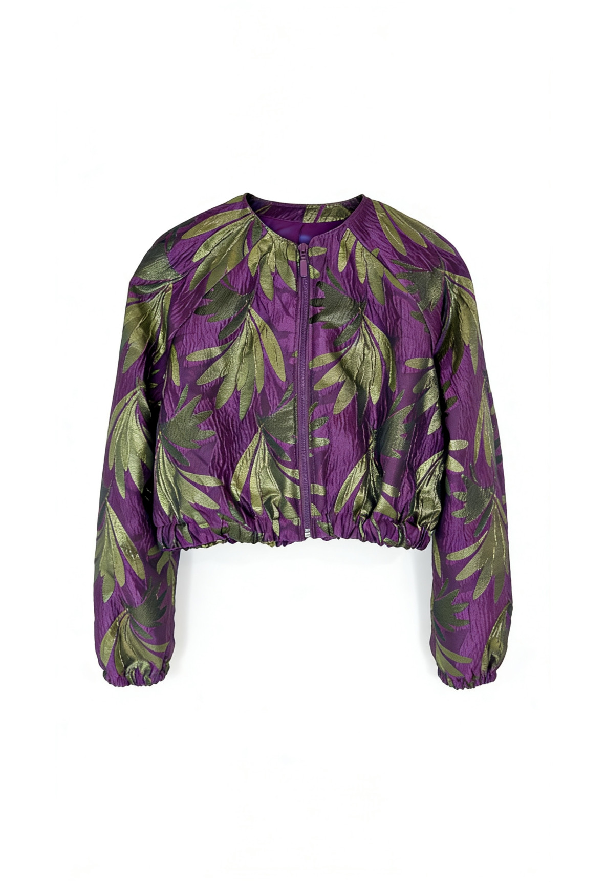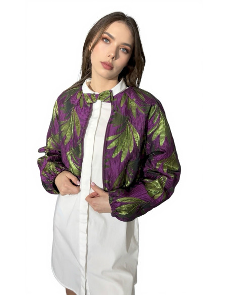 Uszyta z luksusowego włoskiego żakardu, zachwyca głębokim, szlachetnym fioletem, na którym subtelnie wyłania się tłoczony motyw zielonych liści. Delikatny połysk, przełamany nutą złota, sprawia, że tkanina pięknie pracuje ze światłem i wygląda inaczej przy każdym ruchu.