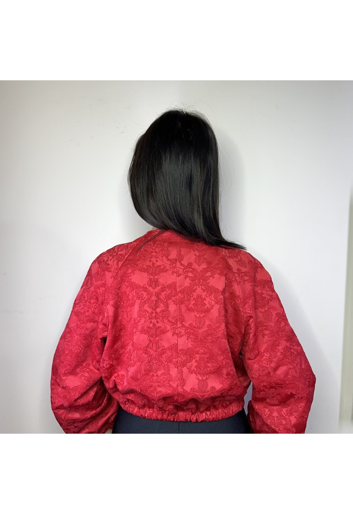 Uszyta z luksusowego, czerwonego żakardu o trójwymiarowej strukturze, zachwyca głębią formy i światła. Wzory 3D subtelnie wyłaniają się z połyskującego czerwonego tła, tworząc efekt, który zmienia się wraz z ruchem i światłem. To tkanina, która nie tylko przyciąga spojrzenia, ale opowiada historię.